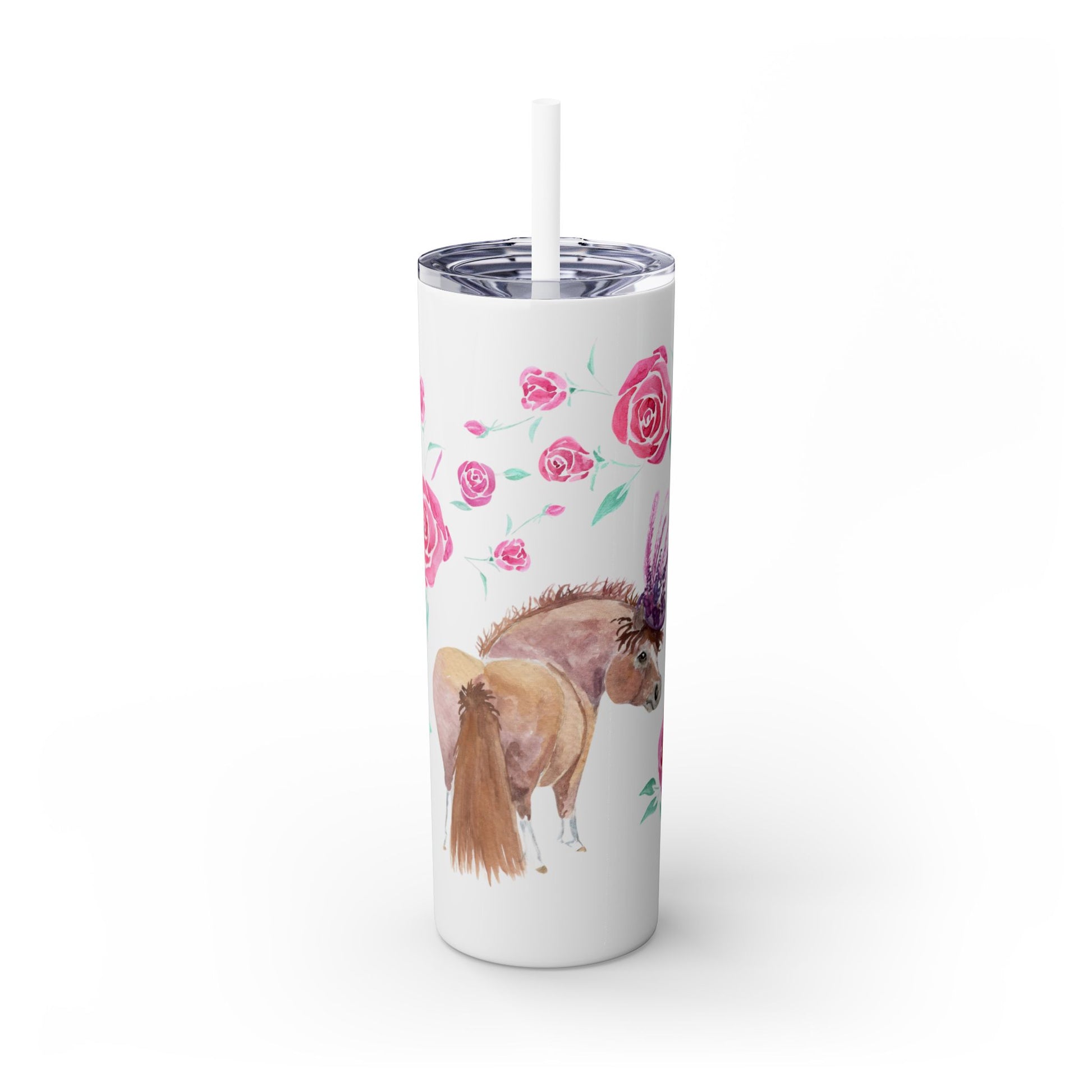 The Adorable Pony skinny tumblers keep your drinks hot for 12h and cold for 24h, making them the perfect sipping companion all year round. With 20oz capacity, these tumblers come in a matte or glossy finish, and feature a tapered shape with a slim design for effortless carriage. The plastic press-on lid with color-matching straw makes for great practicality on the go, while all components are BPA-free and non-toxic; aka perfect for the whole family.