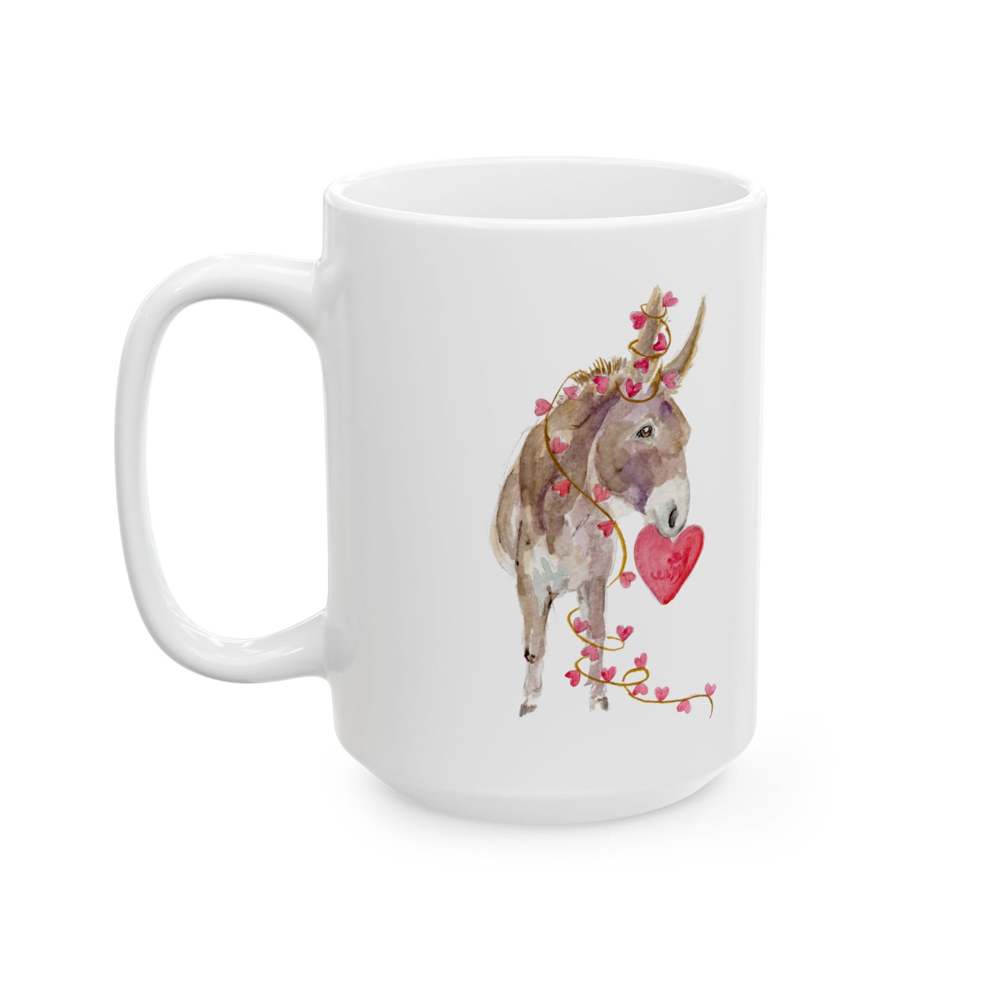 This charming ceramic mug brings warmth, tenderness, and a gentle reminder of love into your everyday moments. Featuring my original watercolor donkey artwork adorned with delicate heart vines and a hand-painted red heart, it captures a sweet, soulful expression of affection, steadiness, and quiet devotion.