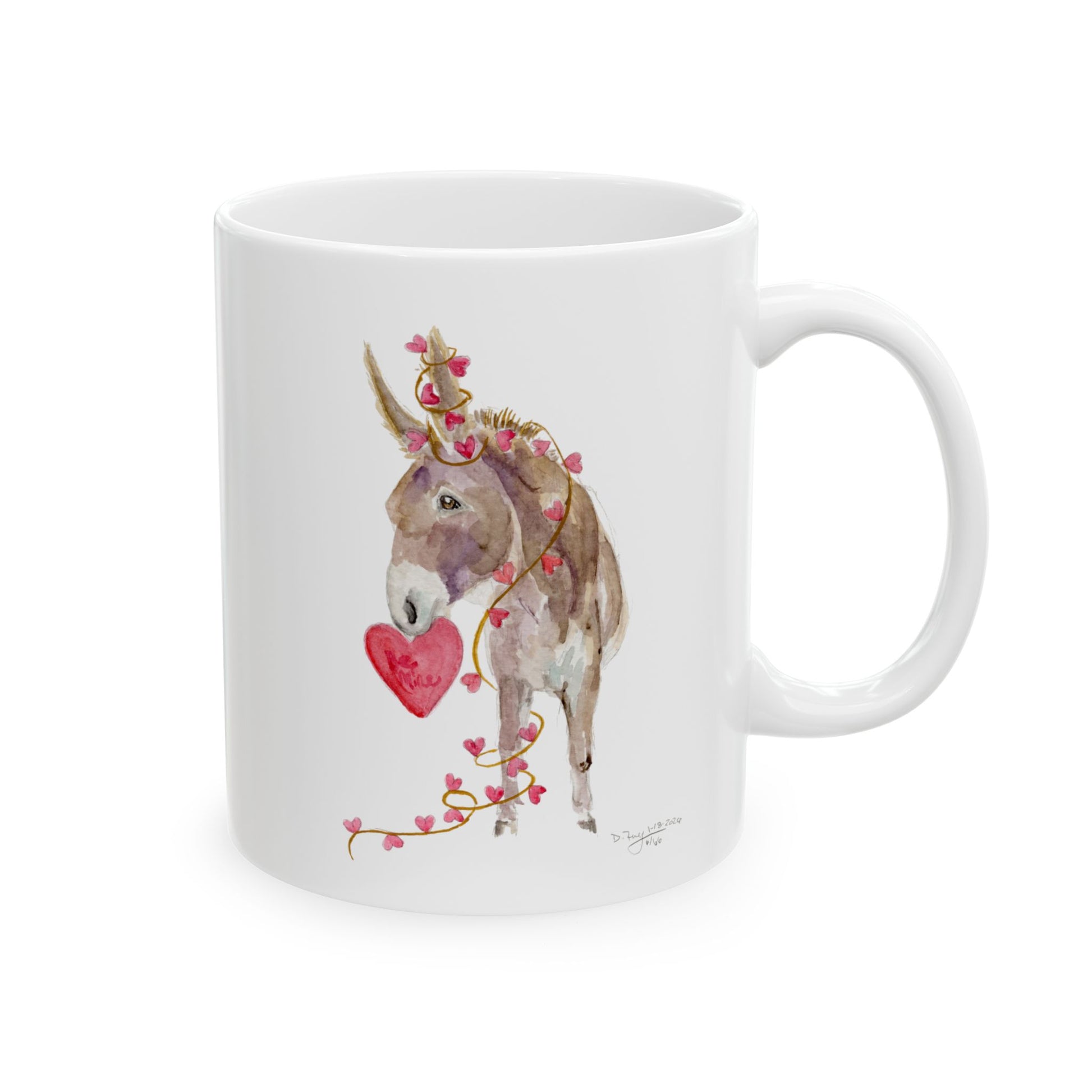 • Features original watercolor donkey artwork with heart details