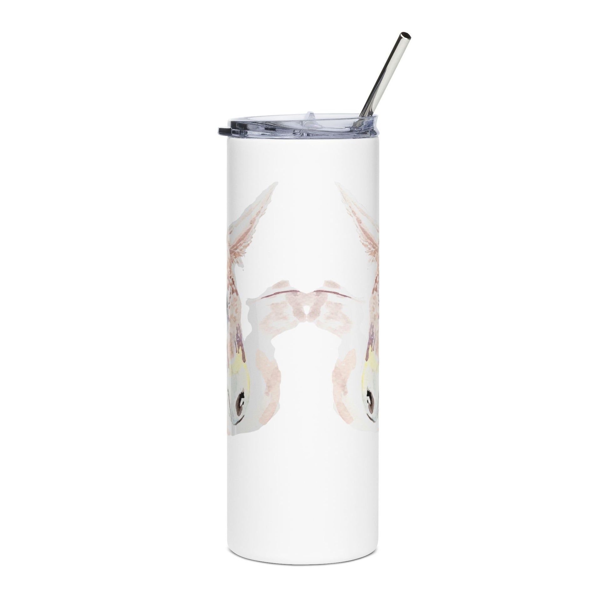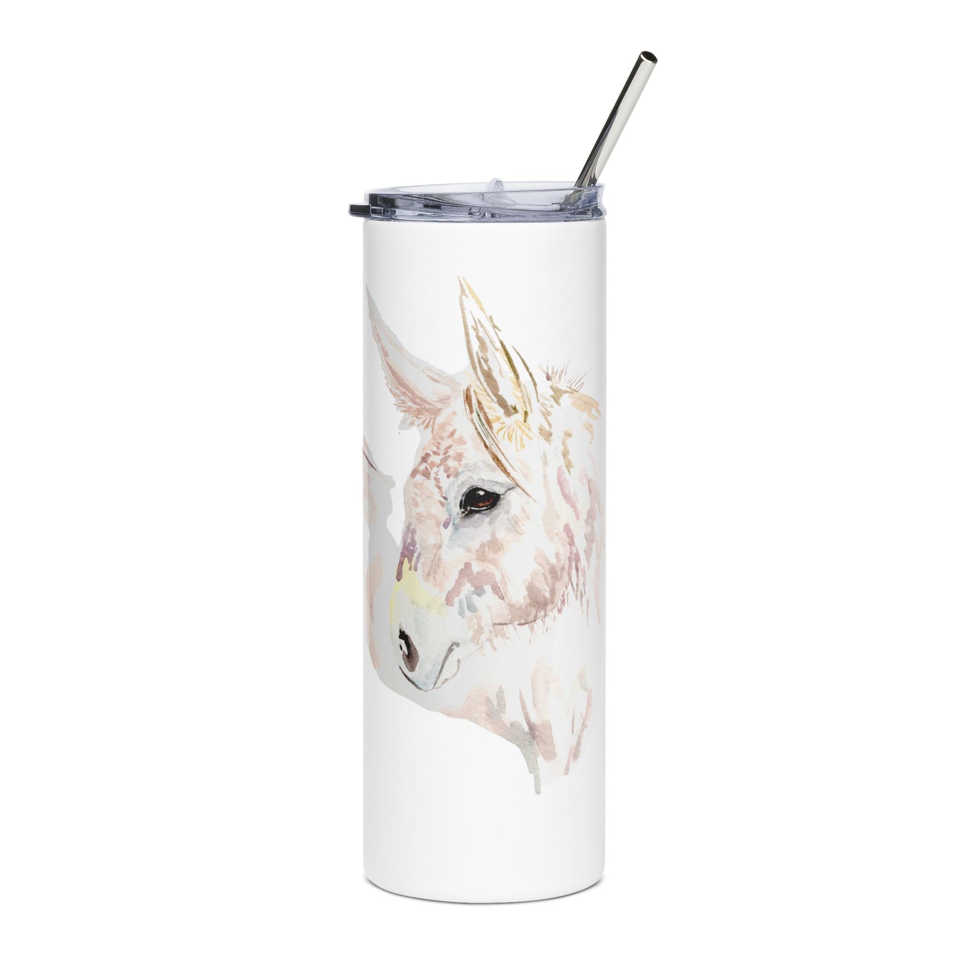 This slim 20 oz stainless steel tumbler features my original watercolor donkey painting, created with loose, intuitive brushstrokes and a softened, expressive focus. The artwork embraces simplicity and feeling over precision — capturing presence, personality, and gentle strength in just a few thoughtful strokes.