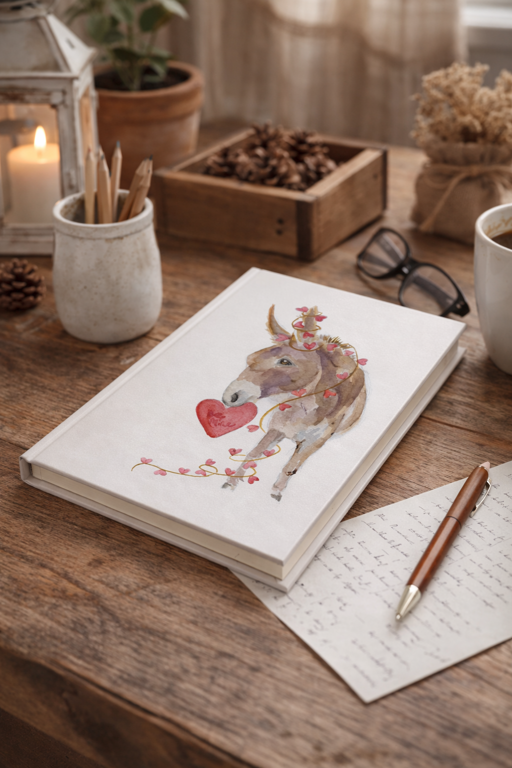 This journal features my original watercolor donkey painting — a piece filled with warmth, quiet devotion, and gentle humor wrapped in love.
