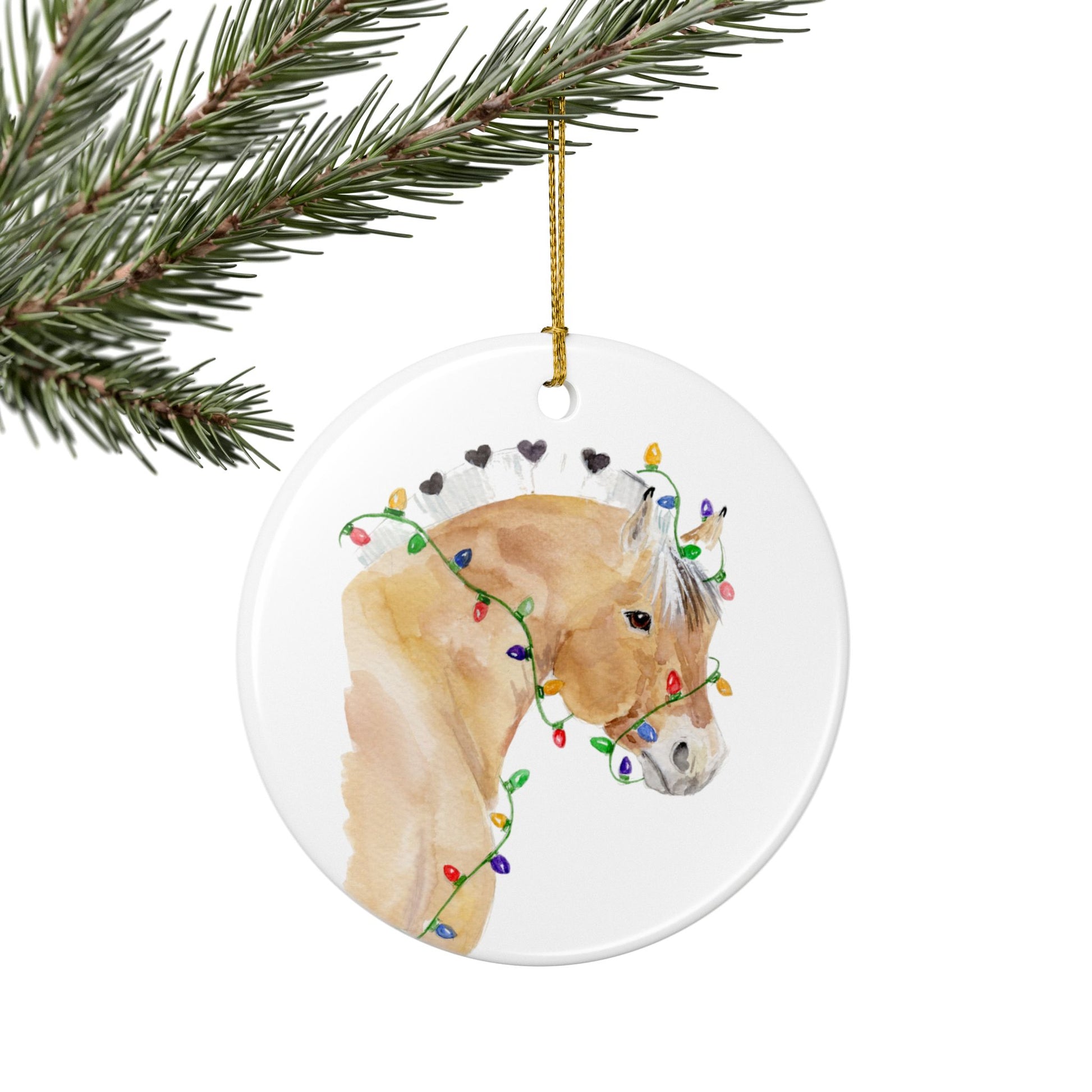 Brighten your holiday season with an ornament that blends heartwarming art and timeless charm. Featuring Lights and Love, my original watercolor of a sweet Fjord horse wrapped in glowing Christmas lights, this elegant ceramic ornament brings a magical touch to any Christmas tree or festive display.