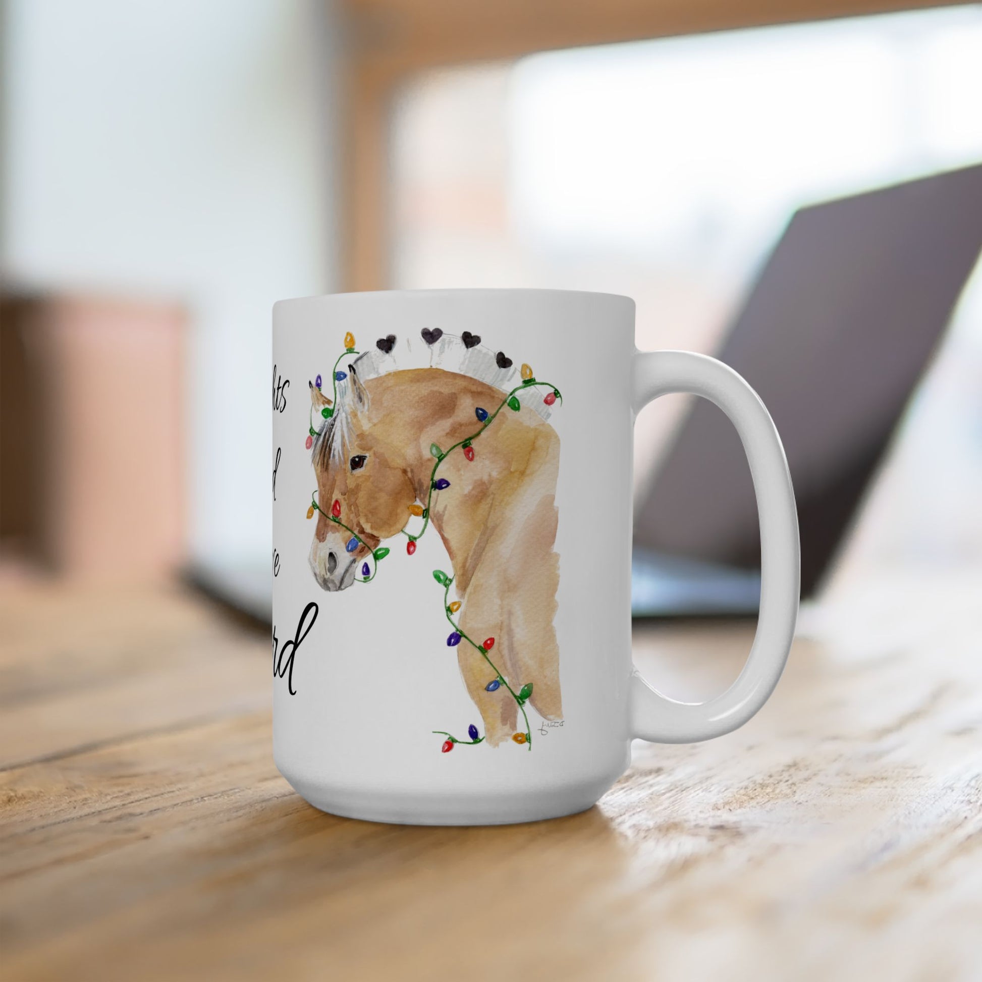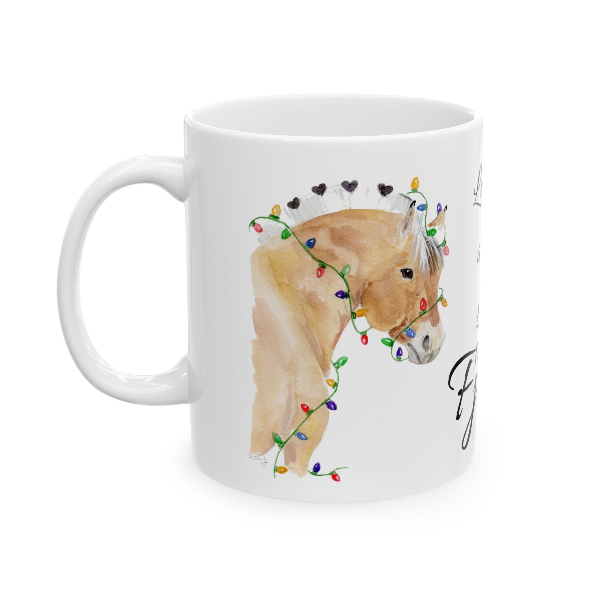 This charming mug features Lights and Love, my original watercolor of a sweet Fjord horse wrapped in glowing Christmas lights — a cozy reminder of warmth, whimsy, and the gentle joy of the season.