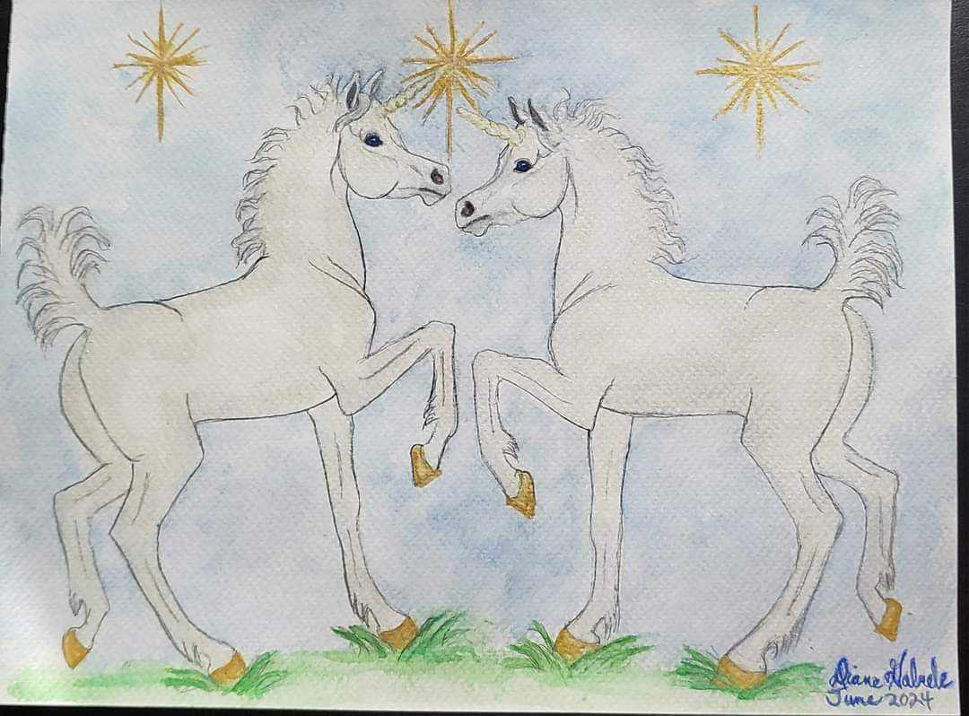 9 x12 watercolor painting of Magical Whimsical Unicorns