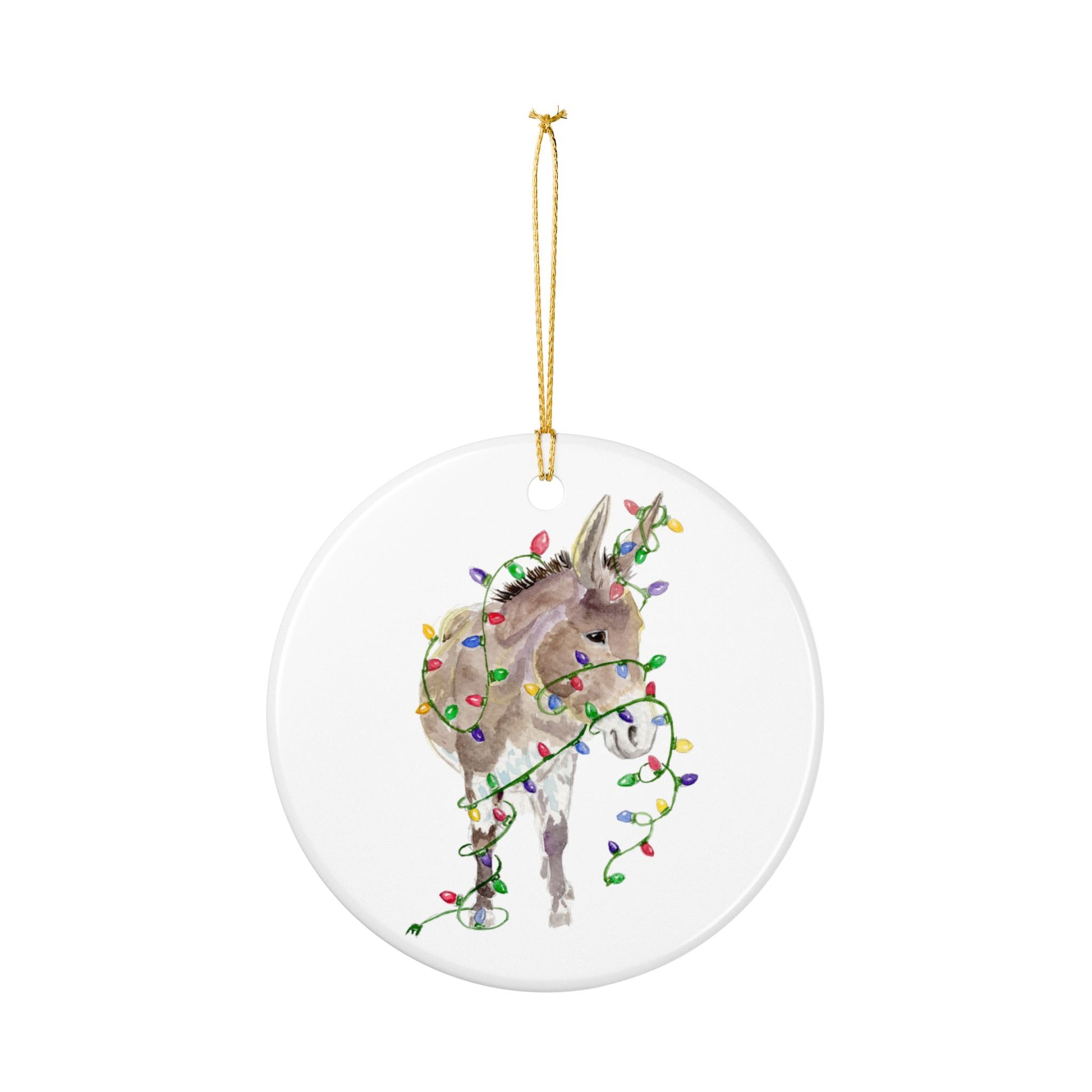 Bring a little humor, heart, and country-holiday charm to your Christmas tree with this adorable ceramic ornament featuring You Light Up My Christmas, my original watercolor of a sweet donkey tangled in colorful Christmas lights.
